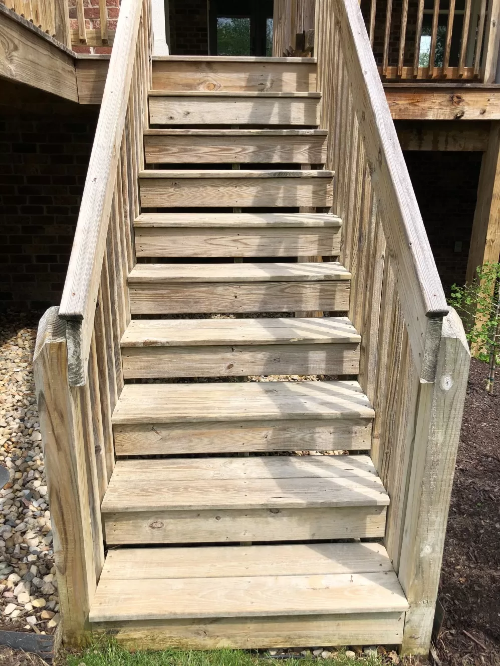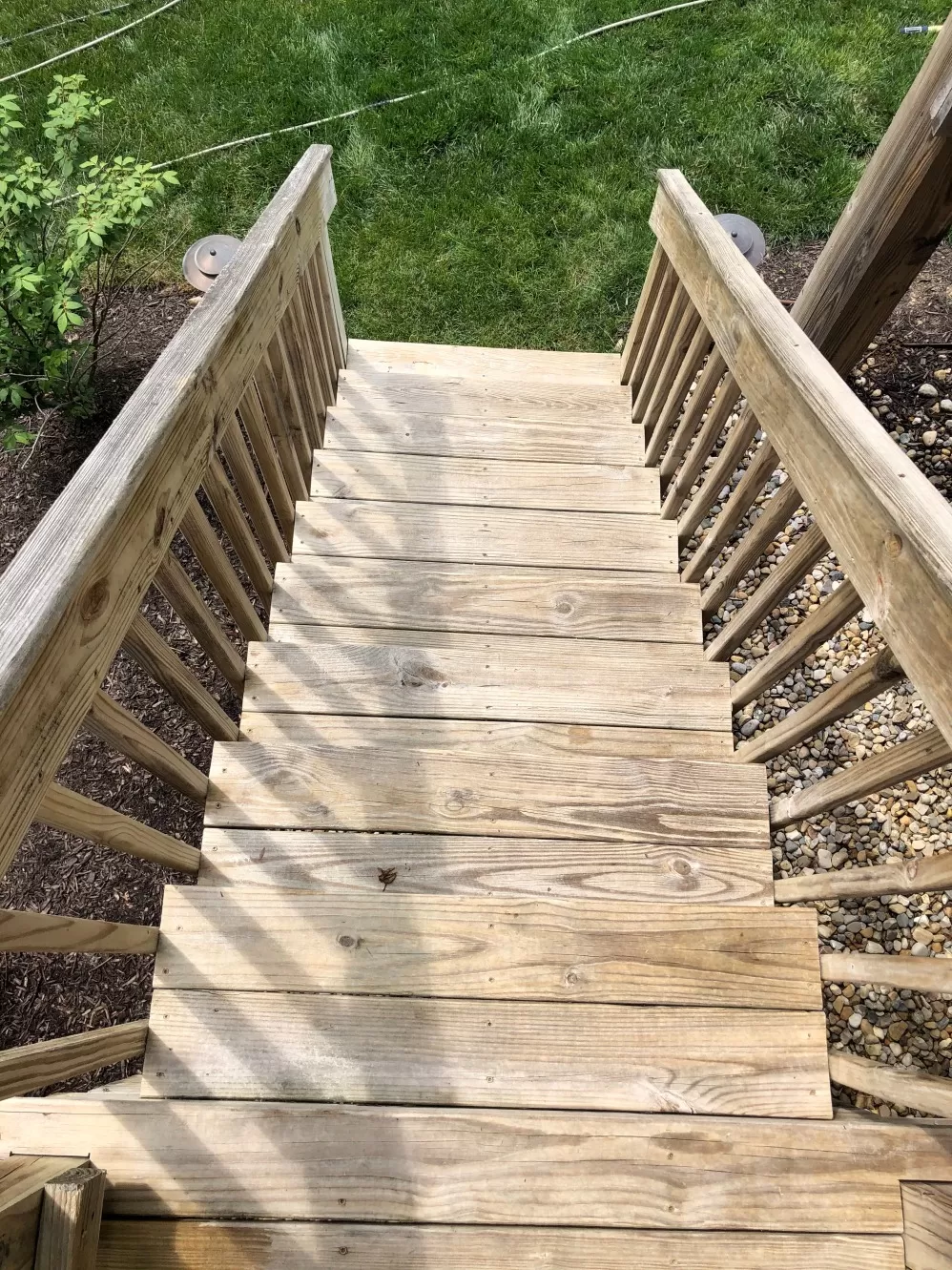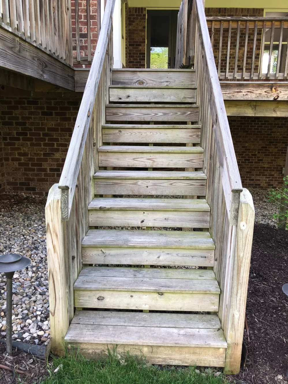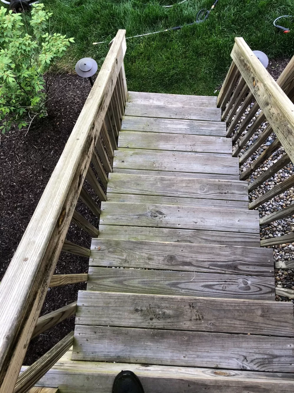 The customer wanted their deck to be cleaned before they stained and sealed it in the coming weeks. We were able to removal all of the green algae from the stairs and railing as well as take off the surface layer of dirt that has built up over the six years from when they first built the deck.
